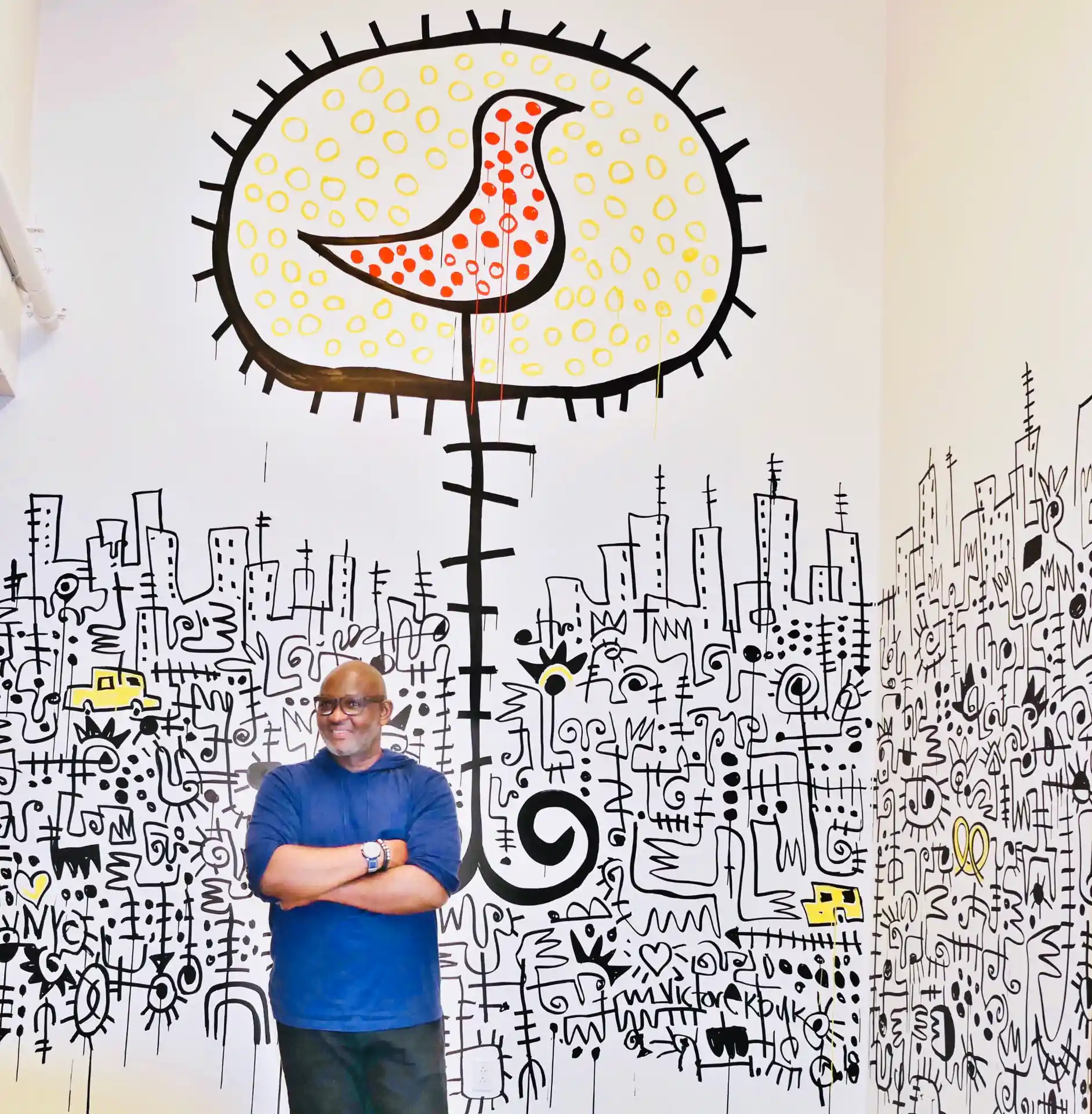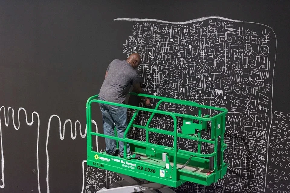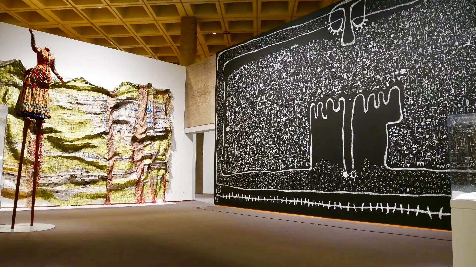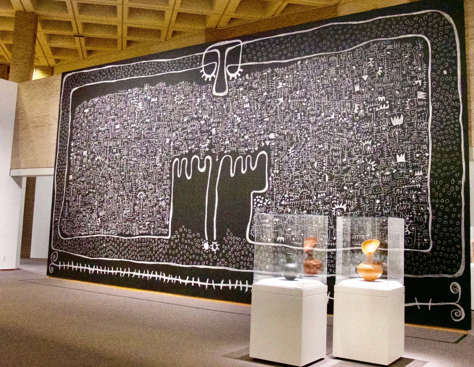 NCMA hosted D.C.-based Nigerian artist Victor Ekpuk as he christened the newly reinstalled African Gallery with an impressively large and detailed site-specific chalk installation. After spending a day communing with the adjacent El Anatsui and other works in the gallery, he pulled out his iPad and began sketching. What emerged was a wall filled with intricate and densely packed abstract figures and geometric shapes—drawn from the aesthetic philosophy of nsibidi, in which signs convey ideas—contained within the embrace of a divinely inspired figure: Divinity.