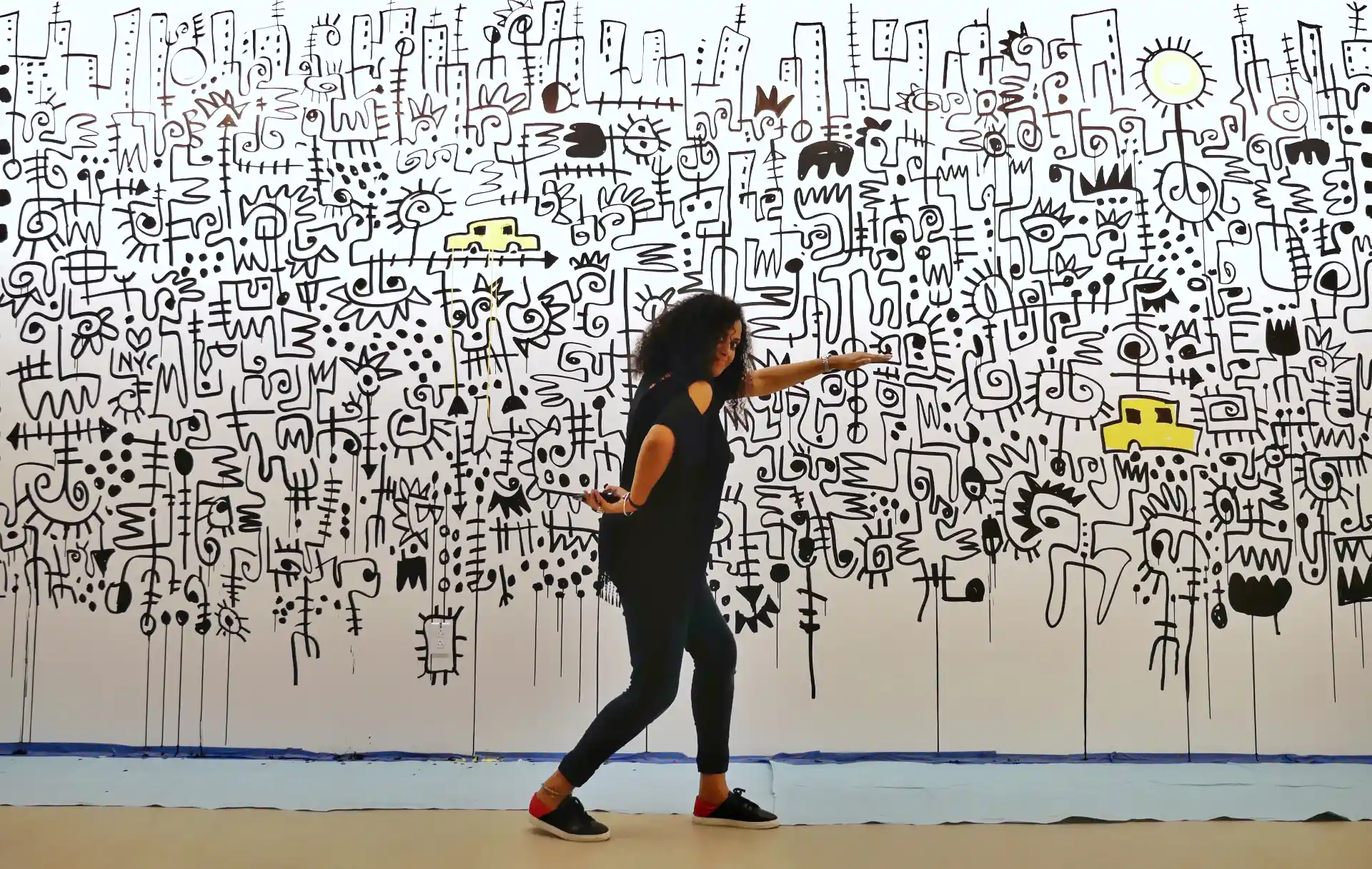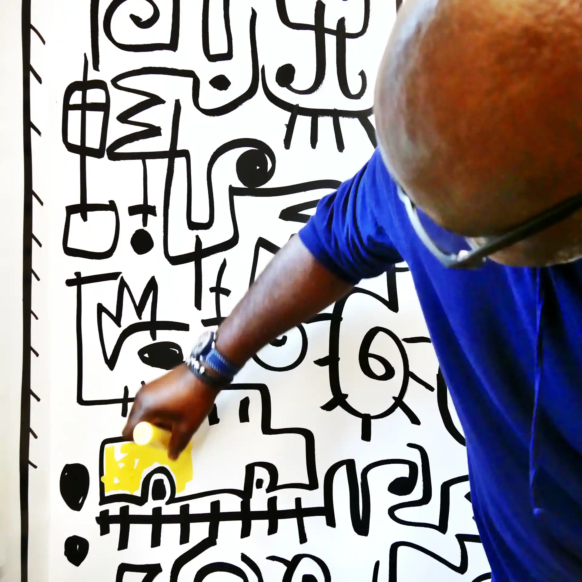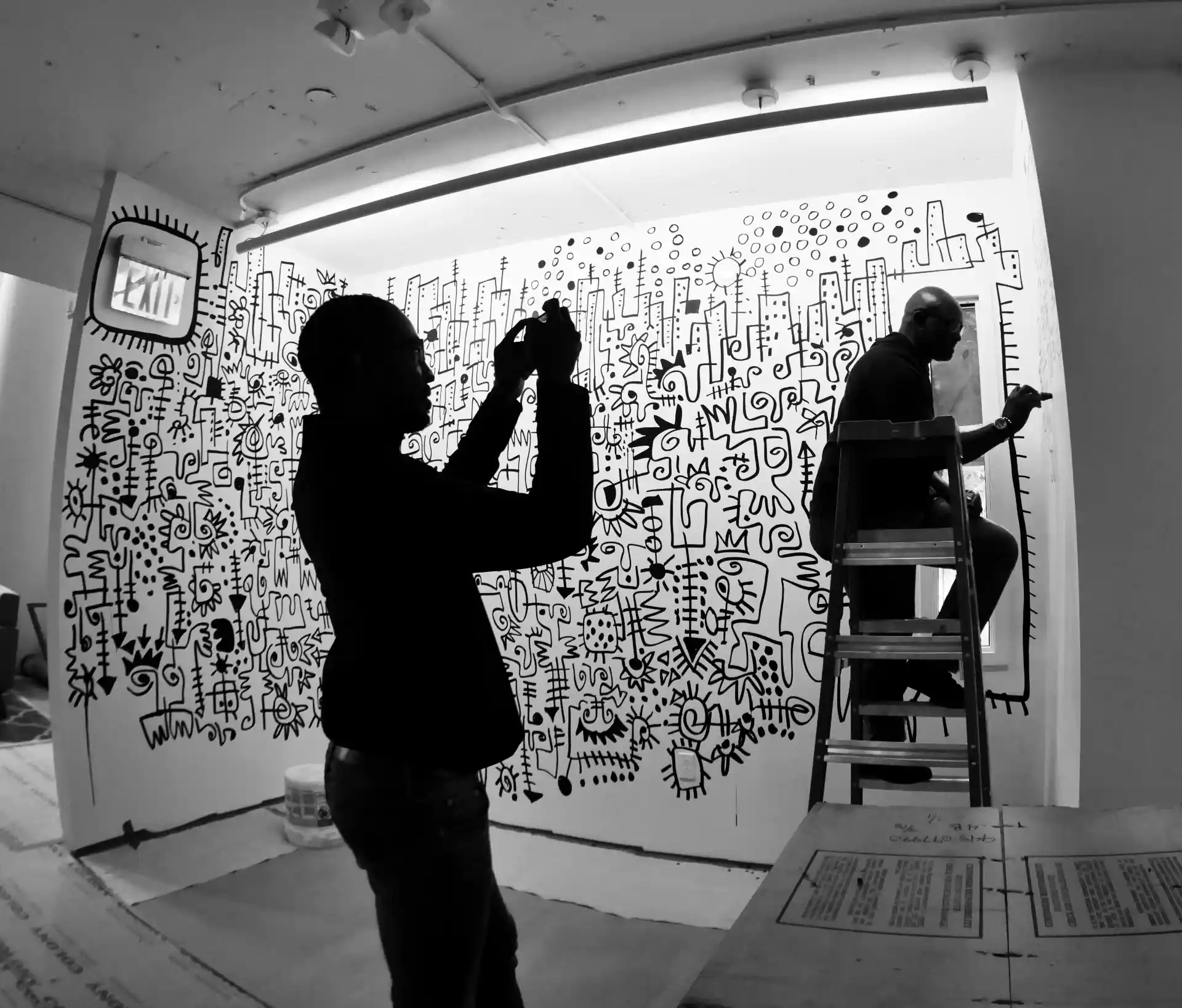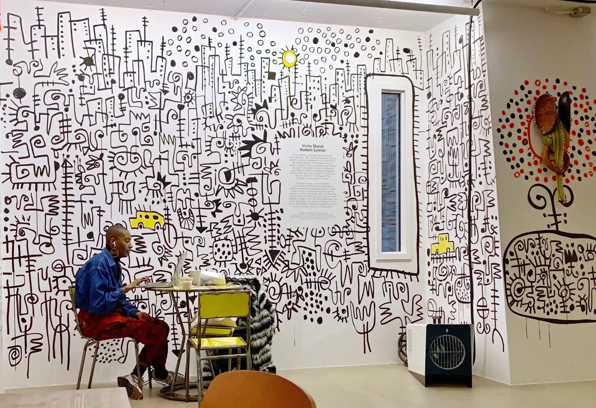 Ekpuk weaves symbols and fleeting impressions of New York City into a large-scale wall drawing that playfully connects the Center with its surrounding neighborhood.