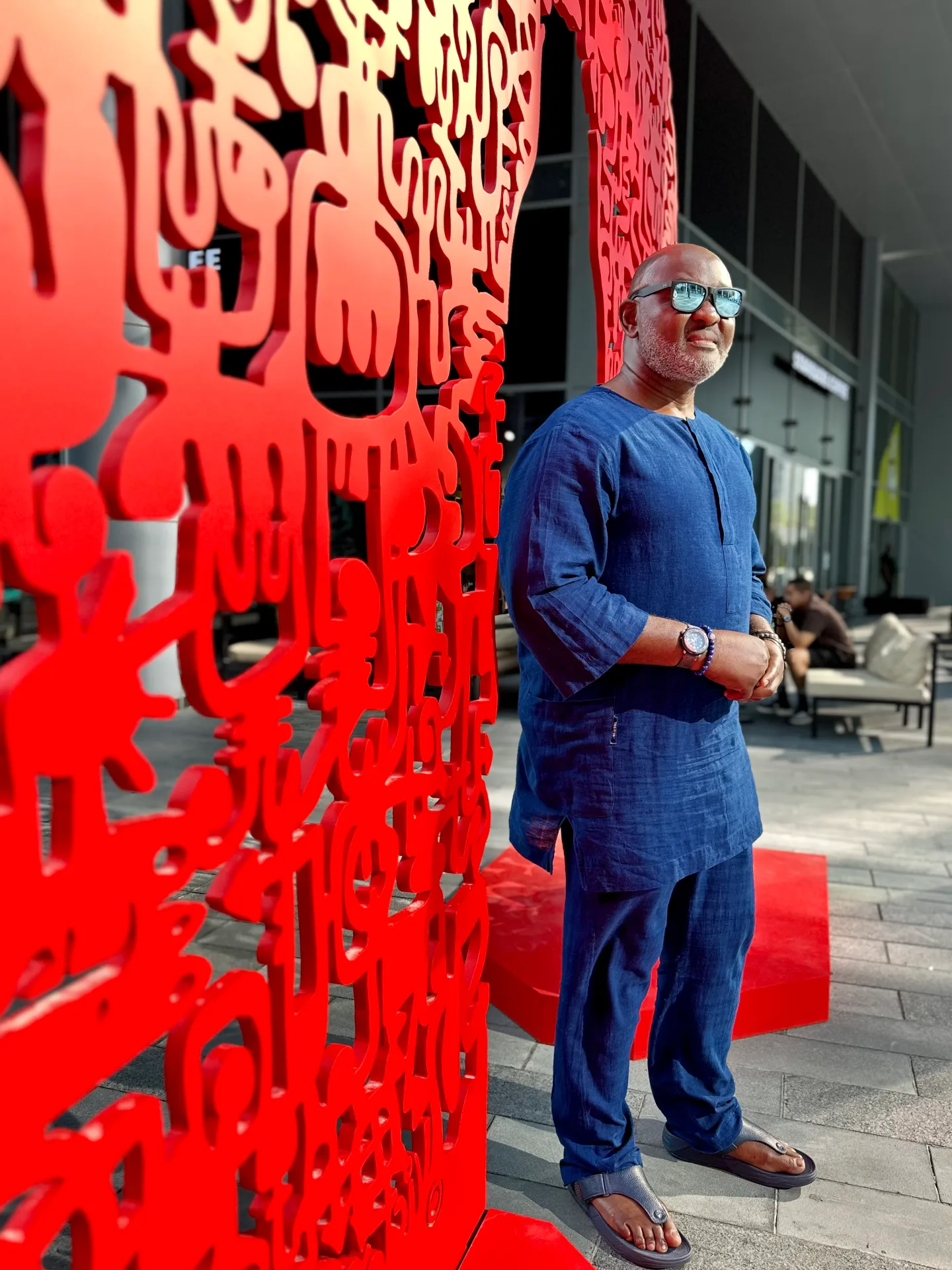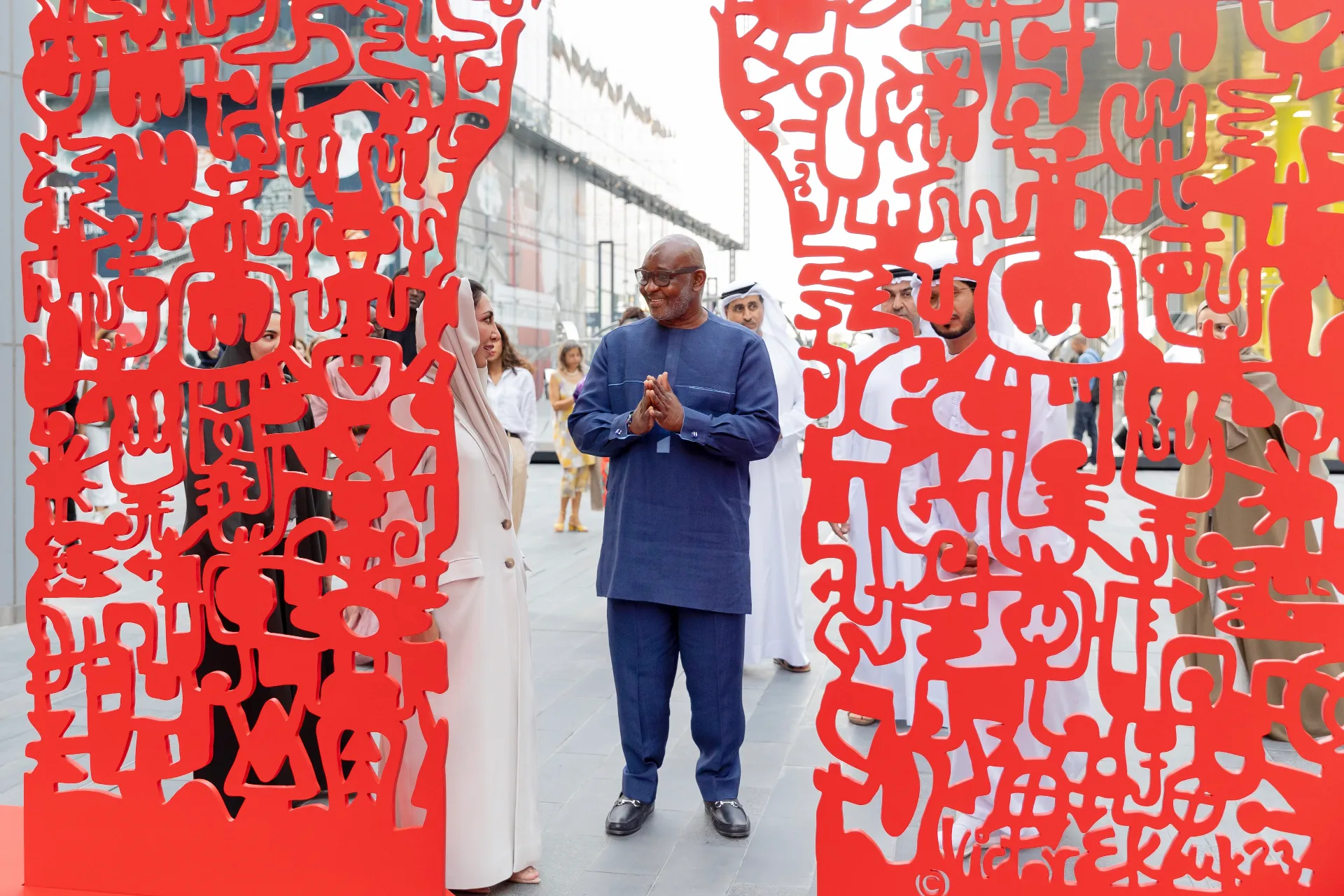 Marking the first public sculpture by an African artist in Dubai, the work takes the form of a human-shaped doorway inviting viewers to physically cross a threshold of history and hope. The surface is intricately adorned with Ekpuk’s contemporary reimagining of Nsibidi, an ancient Nigerian ideographic script.